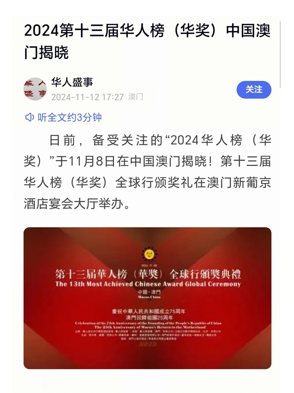 华人盛世报道:2024第十三届华人榜(华奖)中国澳门揭晓