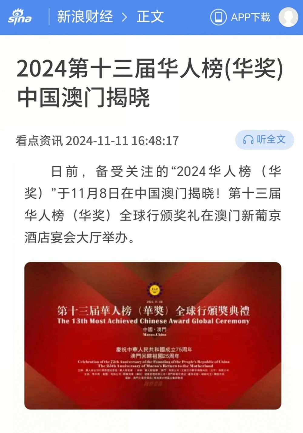 新浪网报道:2024第十三届华人榜(华奖) 中国澳门揭晓