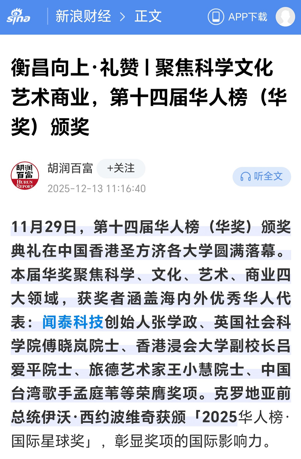 新浪网报道:第十四届华人榜(华奖)颁奖