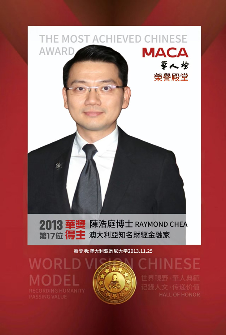 Being a Hong Kong Chinese Australian, he joined Morgan (RBS Morgans), the Royal Bank of Scotland in 2003, and founded the Asian investment department in 2005, creating a precedent for the investment community in Australia. As the investment advisor ranked 1st in Sydney and Chinese Australian renowned in the financial sector in Australia, Chen Haoting has been cooperating with the government’s policy to actively promote the knowledge of money management in the community. And he has enabled more and more communities to pay attention to the pension and wealth management issues successively. Over the years, he has obtained outstanding achievements, created a more solid foundation of life for numerous families and helped many people to realize their dreams. During the global financial crisis, several large financial institutions in Australia closed down and Chen Haoting promptly delivered critical information to the community, and constantly spoke in the media to stabilize public confidence in Australian economy. Australia became the most economically robust western country with the most prominent performance after the global financial turmoil. One of the biggest reasons is the sound financial system as well as the tirelessly cooperation with government policy and serving the community by people like Chen Haoting.